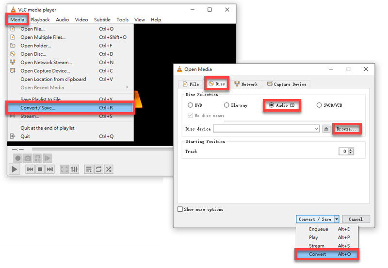 STEP 2. Go to "Media" > "Convert/Save", and switch to the "Disc" tab. After that, select "Audio CD" and click "Browse" to choose the blank CD disc.