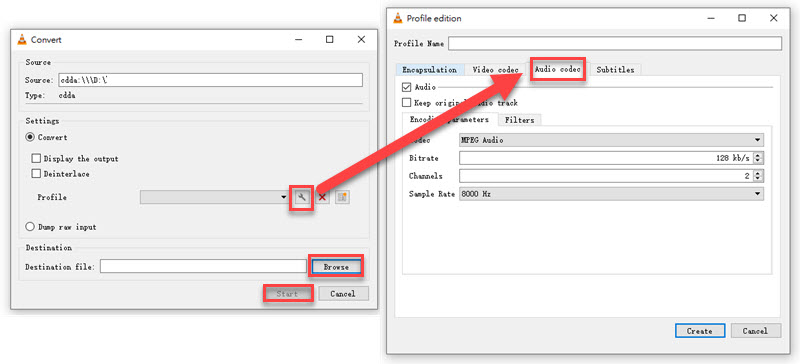 STEP 4. Select the "Tool" icon to bring up the "Profile edition" window. Next, switch to "Audio codec" > "Audio" and adjust parameters like Codec, Bitrate, Channels, and Sample Rate. Don't forget to click "Create" to keep the changes.