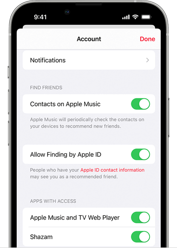 STEP 2. Disable "Contacts on Apple Music" and also "Allow finding by Apple ID".