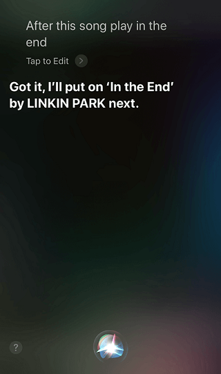 If you listen to some songs and come across particular songs you may want to listen to, you can ask Siri to play your song desired to hear. As for the mania of Linkin Park, I am going to ask Siri to play the song "In The End" after playing the songs I am listening to.