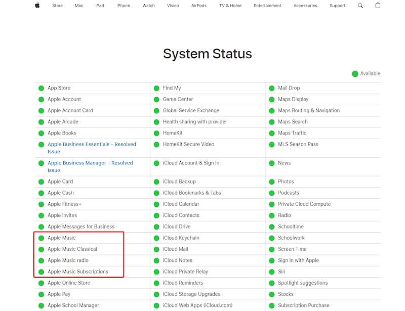 To check if the error is caused by this, go and check Apple Music's system status. If the status is not shown as "Available", the server is down and you can only wait for it to return to normal again.