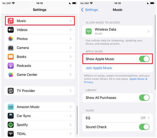 When you update your iOS devices to the latest system versions, sometimes your account may fail to sync properly as your device settings have been changed. If this affects some Apple Music settings, like the "Show Apple Music" option is turned off, Apple Music playlists will be gone and you will fail to access them as usual. To fix this, simply turn it on once again and the problem can be solved. The steps can be followed below:
