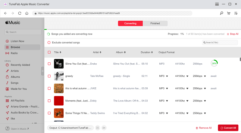 TuneFab Apple Music Converter V4.0.0 also turns the converting window to a floating list set on the right side, enabling you to manage the list and check all selected Apple Music tracks that are getting ready to download offline. Compared with the drop-and-drop music-adding method, it must be easier and more efficient for you to create the converting list and prepare for the later music download.