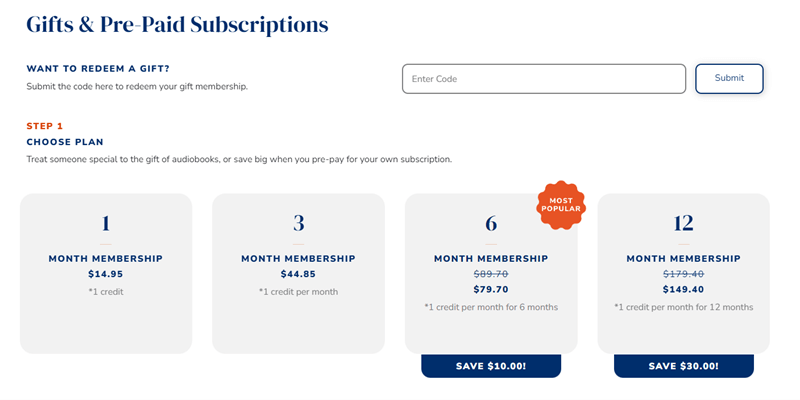Although Audiobooks.com doesn't come with an option of individual-book gift, there are still several membership options for you to send an audiobook membership for enjoying endless books. Go to Audiobooks.com Gift Center for further details. Membership durations available are 1 month, 3 months, 6 months, and 12 months.