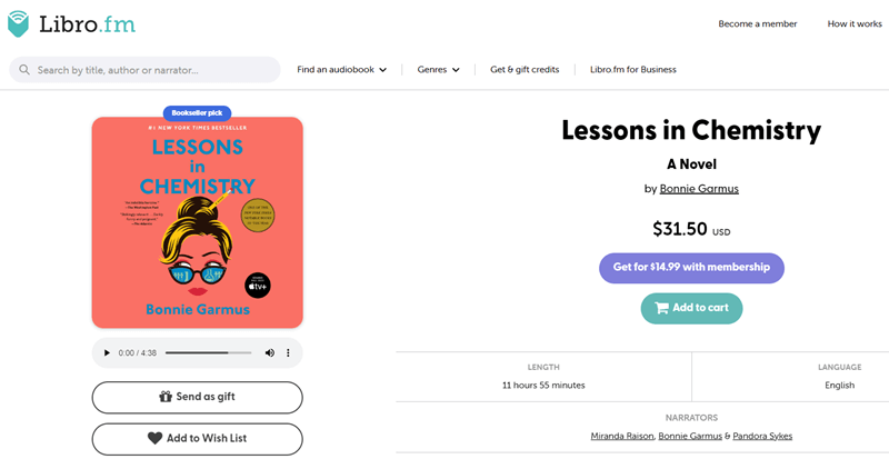 On Libro.fm, you can join their membership plan to buy the book. The first-month subscription only costs you $0.99. Or you can gift audiobooks directly to anyone. No subscription is necessary and their books are also DRM-free, which allows your friends and families to listen to the book on multiple devices.