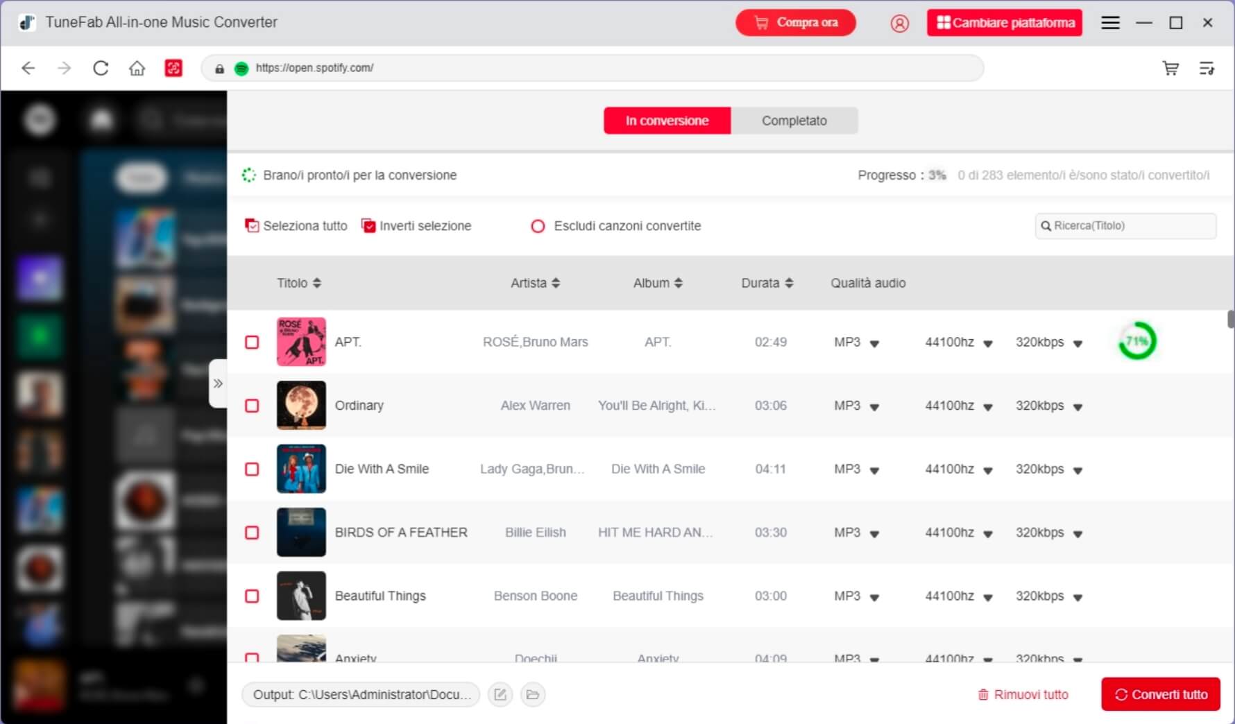 Una volta impostato tutto, clicca il pulsante "Converti tutto". TuneFab inizierà a scaricare e convertire i tuoi brani Spotify per renderli privi di DRM. Puoi monitorare il progresso della conversione in tempo reale direttamente sull'interfaccia.
