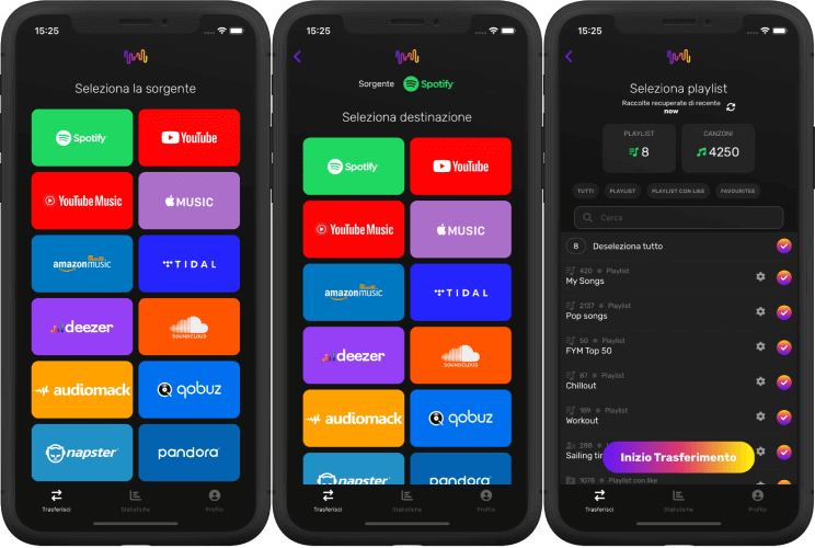 | Piattaforme di Trasferimento | Spotify a qualsiasi | Spotify a 41 piattaforme streaming | Spotify a oltre 125 piattaforme streaming | Spotify a 17 piattaforme streaming |