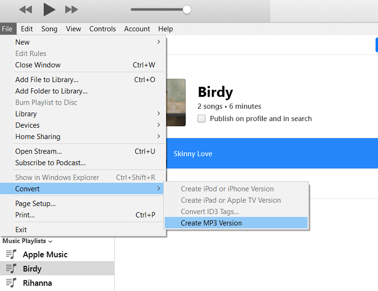 Now you can select songs that you want to convert to MP3 from iTunes library. Then you need to navigate to "File" > "Convert" > "Create MP3 Version".