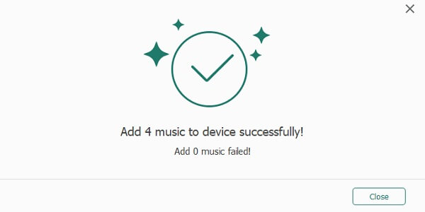After you choose the songs wanted, click at "OK", then WeTrans will add MP3 music to your iPhone immediately. Once songs are added successfully, you can click the Close button to finish transfer.