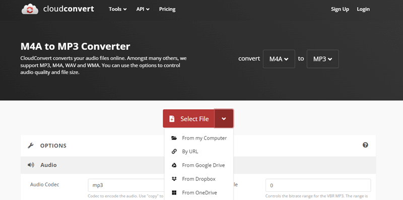 Unlike desktop solutions, online tools can convert M4A to MP3 online for free. While less powerful than desktop software, they are suitable for small, short-duration conversions. These tools often lack batch conversion, limit duration, provide lower quality, or have slower speeds. Here we take CloudConvert as an example.