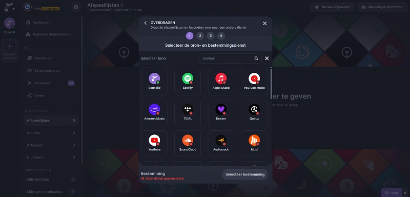Houd er echter rekening mee dat gratis gebruikers slechts één afspeellijst tegelijk kunnen overzetten en elke afspeellijst minder dan 200 nummers mag bevatten. Als je alleen een lichte afspeellijst hoeft over te zetten, dan kan Soundiiz een nuttige keuze zijn. Zo werkt het: