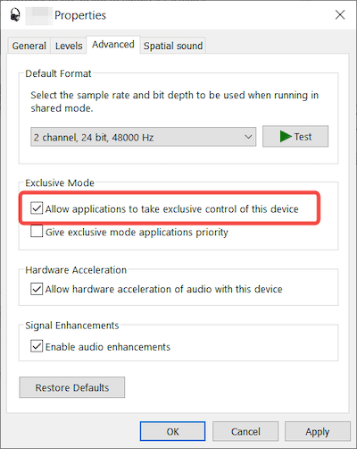 Stap 1. Klik met de rechtermuisknop op het luidsprekerpictogram in de taakbalk en kies Geluidsinstellingenen selecteer vervolgens uw standaard audioapparaat. Klik Aanbod, ga naar de Geavanceerd tabblad en schakel het selectievakje 'Toepassingen exclusieve controle over dit apparaat geven' uit.