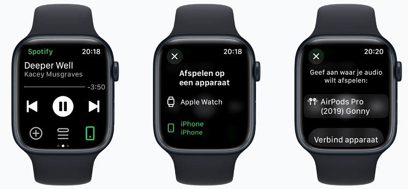 Als je een draagbare Spotify MP3 speler nodig hebt, dan is de Apple Watch zeker een uitstekende keuze. Het biedt dezelfde naadloze eco-integratie met de iPhone als de iPod Touch, wat ultieme draagbaarheid garandeert. Door de Apple Watch te koppelen met je iPhone, kun je je Spotify-afspeellijst synchroniseren met de Apple Watch en met Bluetooth-koptelefoons luisteren tijdens het hardlopen of sporten, zonder dat je je telefoon nodig hebt.
