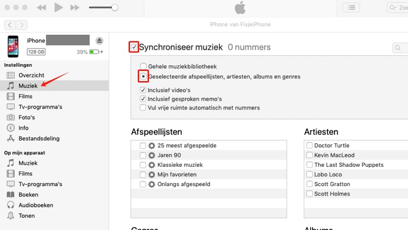 Stap 4. Ga in het linkerdeelvenster naar het tabblad "Muziek". Selecteer "Muziek synchroniseren" en vervolgens "Geselecteerde afspeellijsten, artiesten, albums en genres".