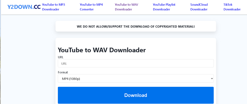 Als derde optie is er Y2Down.cc, een toegankelijke en gratis YouTube naar WAV converter die perfect is voor wie snel audio van hoge kwaliteit wil extraheren uit video's. Dit online platform is ontworpen voor eenvoud en biedt een naadloze manier om YouTube-nummers naar WAV te converteren, zonder registratie of installatie.