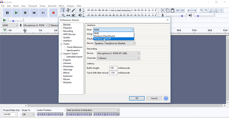 Step 2. Click on "Edit > Prefences" from the menu bar and select "Windows WASAPI" in the "Host" section. Then, move on to the "Recording Device" dropdown to select your computer's speaker or preferred sound output device as the input source.