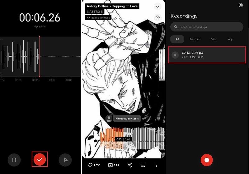 Step 2. Open your Android's built-in voice recorder app and tap the "Record" button at the bottom of the screen. Then, switch back to the SoundCloud app and tap the "Play" button to start playing the music.