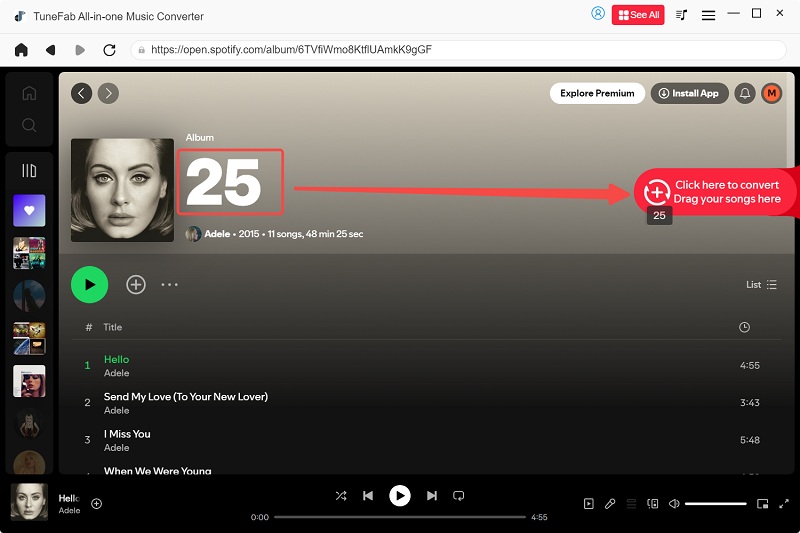 But due to DRM protection, directly downloading Adele's songs to MP3 from Spotify is impossible. Utilizing a proper tool like TuneFab Spotify Music Converter can help you get rid of trouble. It is standalone software to help you download songs from Spotify to MP3/M4A/ WAV/FLAC/AIFF/AAC/ALAC. Most importantly, this tool enables you to download Adele’s songs from Spotify even without a subscription.