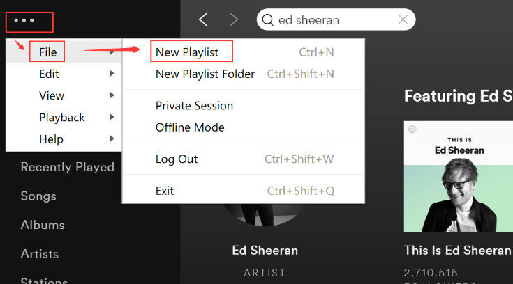 After getting your own premium version, you can log in your Spotify account and create a new playlist to copy your favorite playlist songs inside: Find the "..." > "File" > "New Playlist" to add the new playlist to your Spotify account.