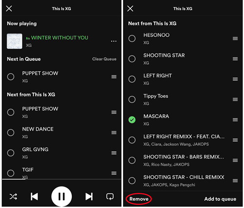 Step 4. To remove a song from the Spotify queue, simply slide from the three-line icon all the way to the left. Alternatively, you can tap "Clear" next to "Queue" at the top to clear all tracks.