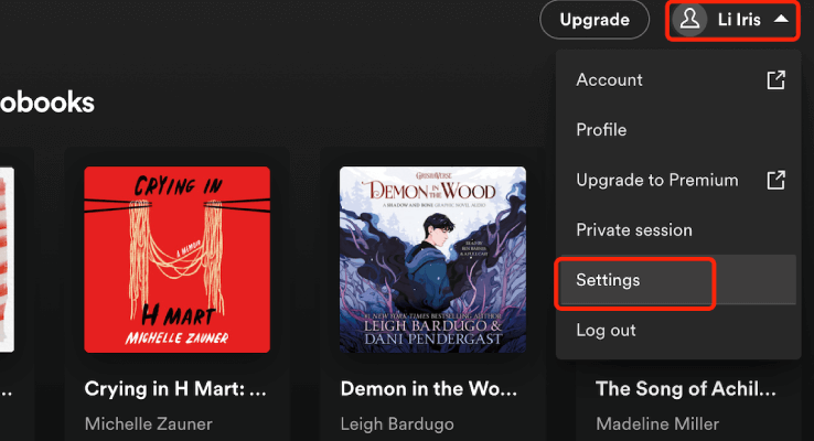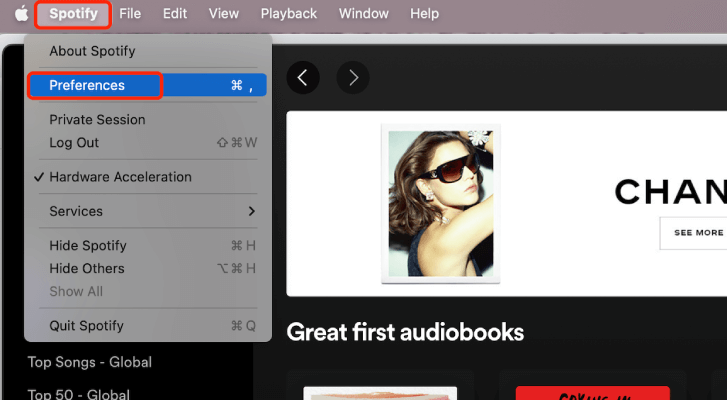 Step 1. Click on "Spotify" in the upper left corner of the home page and select "Preference" or click the user name icon on the home page of Spotify and select "Setting".