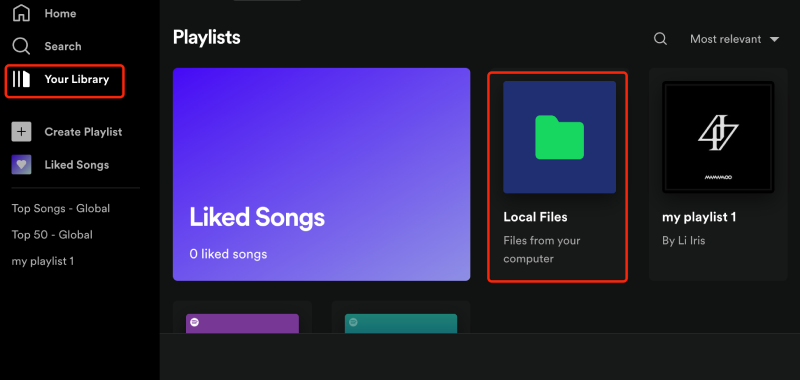 Step 4. Once you have set the right source for your local music, click on "Your Library" and you will see "Local Files". The songs in "Local Files" are the same as other songs on Spotify and you can freely add them to your favorite playlist.