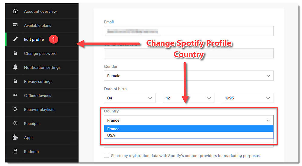Go to Spotify's official website and then Log in Your Spotify account to enter your Spotify Account Profiles. And then Choose Edit profile to change your country.