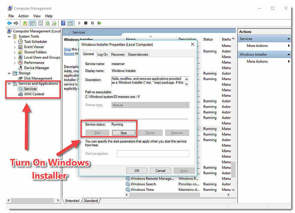Back to your Windows desktop and then find out "This PC" and then right-click to "Manager". Then you will see the main interface of "Computer Management". Scroll down to "Services and Applications" and click to Down-arrow button > "Services" to find out "Windows Installer". Then right click "Properties" and then see if your Windows Desktop is running.