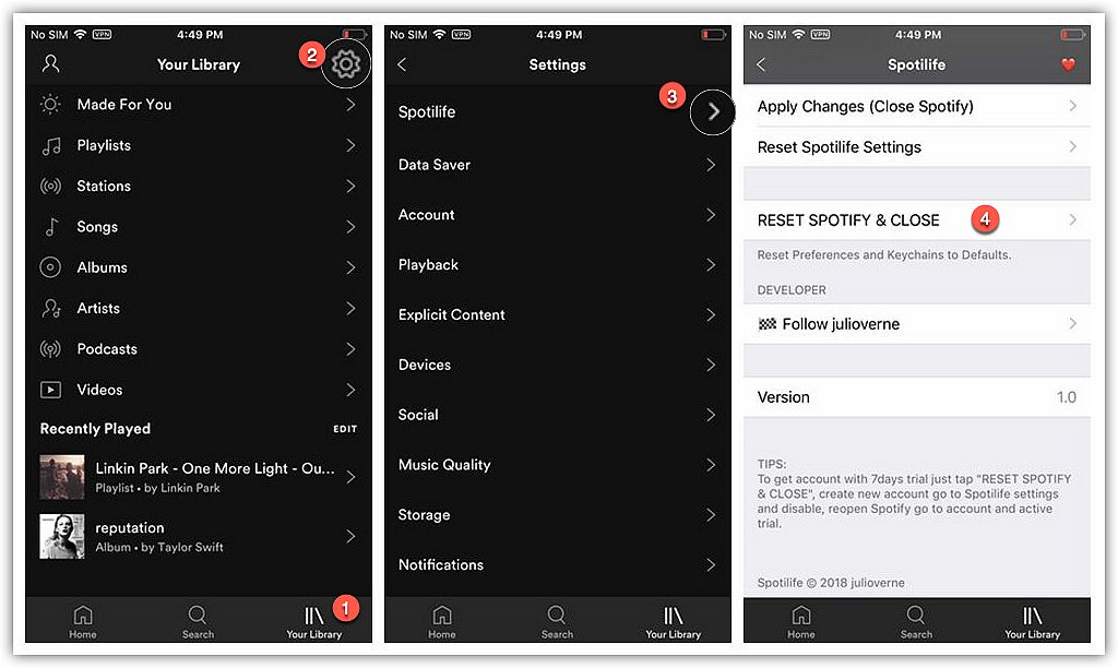 Note: By tapping RESET SPOTIFY & CLOSE, you will get an account with a 7-day free trial of Spotify Premium. When you reopen Spotify++, you can activate Spotify Premium with a newly created account.