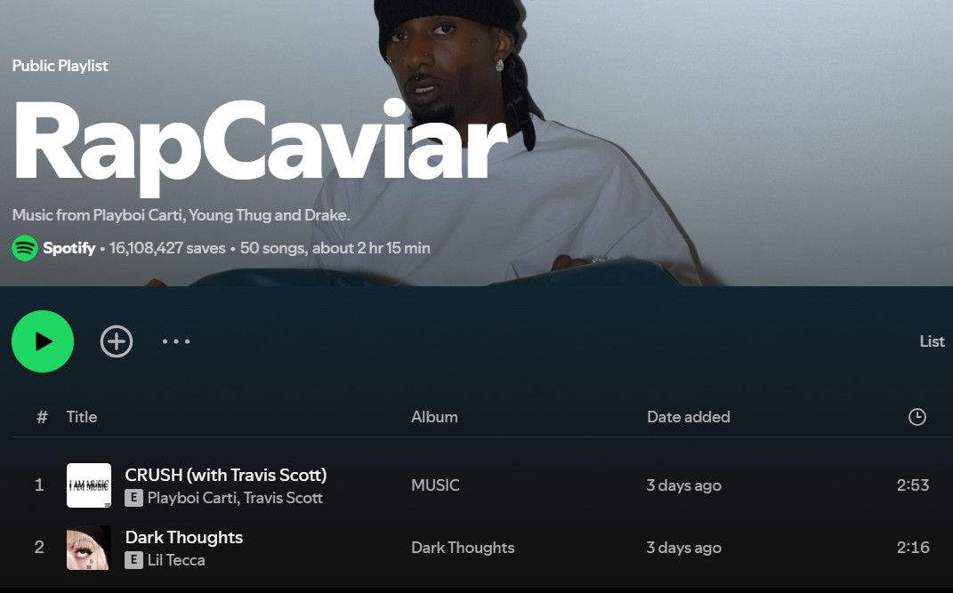 RapCaviar features 50 top hip-hop songs and has over 16 million followers. Whether playing a game or exercising, play it from the beginning and let the beat follow you. The playlists total about two hours or more.
