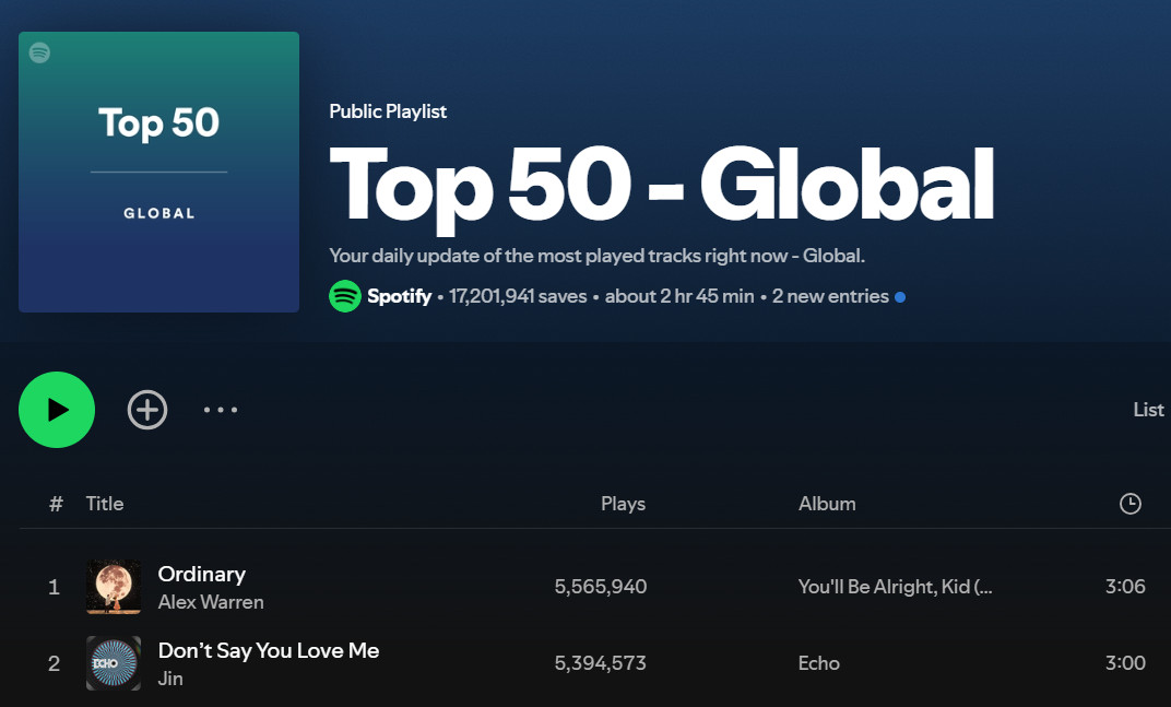 The previous list featured popular songs. If you want to listen to music released over a wider timeframe, look no further than Top 50 - Global.