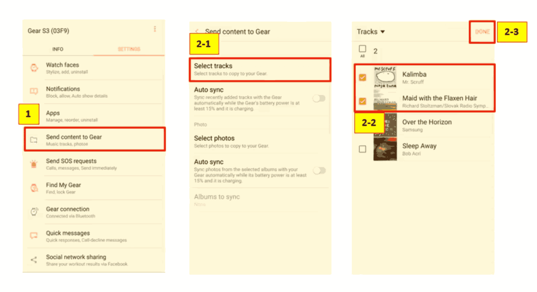 1. Open Samsung Gear. Go to "Settings," and then tap "Transfer Content to Gear" > "Select Tracks".