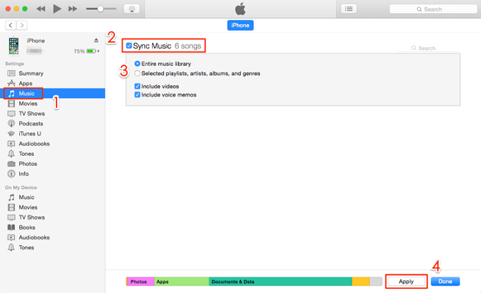 2. Click on "Music" option. Select the "Entire music library" or "Selected playlists".