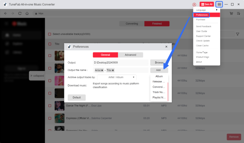 You can also preset output preferences by clicking the hamburger icon in the menu. Under the General option, you can customize the output folder and categorize the downloaded songs based on playlists, artists, albums, and more, allowing for efficient organization and easy access to your music collection. Under the Advanced option, you can choose your desired audio format, such as MP3, M4A, FLAC, WAV, AIFF, AAC, and ALAC.