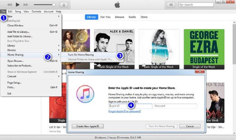 STEP 2. Enable Home Sharing by going to File > Home Sharing, and select Turn on Home Sharing. Use your Apple ID and password.