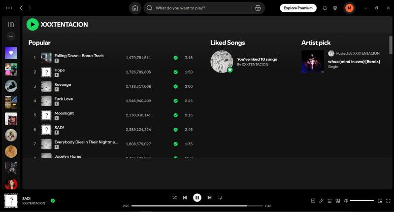 XXXTentacion is still one of the most popular rap artists on the Spotify platform. His music continues to draw new listeners worldwide, with around 36 million active listeners monthly. His masterpieces "SAD!", "Jocelyn Flores", and "Moonlight" have each reached 2 billion clicks. Following his death, the track "SAD!" topped Spotify's global rankings, breaking 10 million streams in a single day.