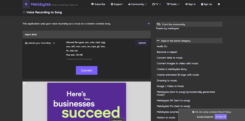 If you are considering finding an online voice to music converter, Melobytes can be an ideal option you should not miss. You will be required to register an account in order to use its voice to music conversion service. Simply by uploading your recordings to the platform, Melobytes will quickly process the voice conversion, with simple editing functions available to customize the outputs without hassle. However, there are only 5 free quotas provided every day, and you can't directly record sounds like other professional software can do. It's better for basic voice to song conversion without strict demands on audio editing.