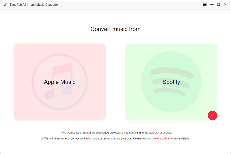 STEP 1. Once installing TuneFab All-in-One Music Converter, launch the software. From the main interface, select a streaming music platform such as Spotify to get started. Once entering its web player, you will need to log in via your music account.