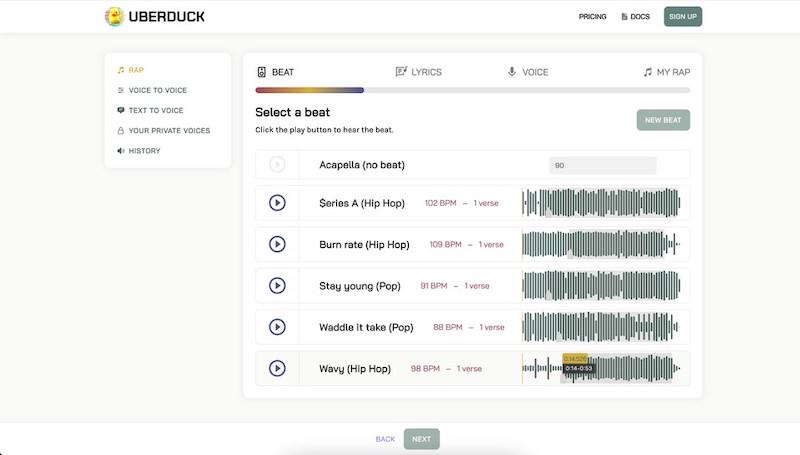 For rap singing, the best voice to music converter to help generate complete tracks can be Uberduck. This simplified and lightweight software is only equipped with 3 powerful features: text to voice, voice to voice, and the AI-generated rap.