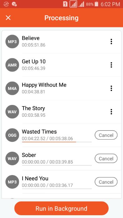 All Audio Converter is an all-in-one audio editing tool for Android. Unlike the previous applications, this tool primarily focuses on audio-to-audio conversion. It supports nearly all audio formats, including MP3, AAC, M4A, OGG, WAV, and WMA. Once you upload a music file, you can view all its information and then customize settings such as the expected file size, export format, frequency, channel, and bitrate.
