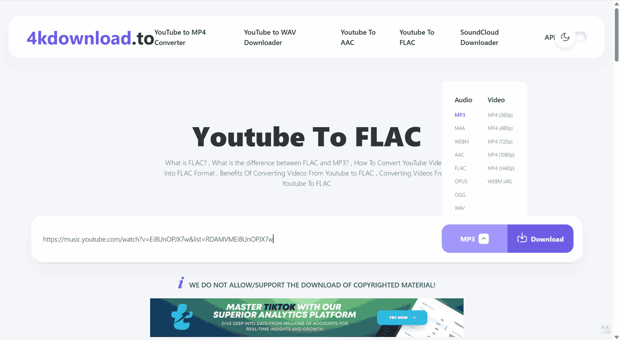 4KDownload.to is another convenient solution. It's an online YouTube to FLAC downloader that can download high-quality FLAC audio directly from YouTube with just the URL and can be accessed from any device. However the site contains frustrating ads, and each click may result in pop-ups.