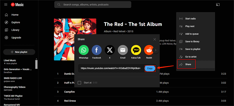 Step 1. Visit the YouTube Music web player, find the song you like, click the "three-dot" button, and copy the URL of it under the "Share" tag.