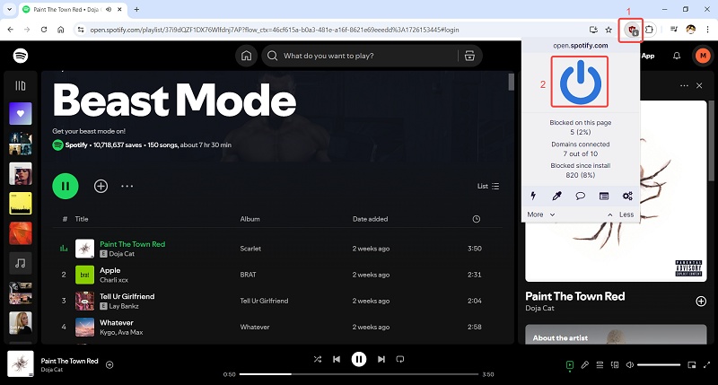 第一步。 打开 Spotify网络播放器 并听音乐。然后点击扩展栏中的 uBlock Origin 图标并打开扩展。然后您就可以在线享受 Spotify 音乐,而不会受到广告的影响,就像您已经破解了 Premium 一样。