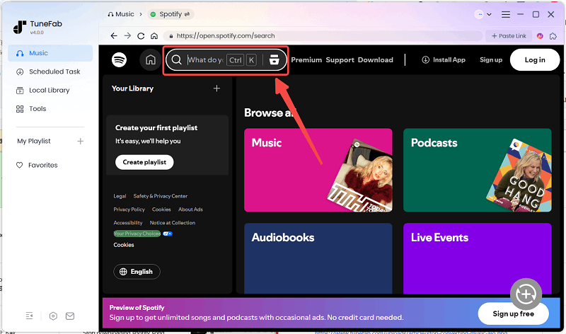 它是一款多功能工具,可以完美地 Windows 11/10/8.1/8/7、macOS x 10.12 及以上。在这个软件上,我可以搜索 Spotify 的歌曲、播客或有声读物,并将它们添加到你的播放列表中,就像在官方 Spotify 应用程序上一样(当然也可以收听它们)。