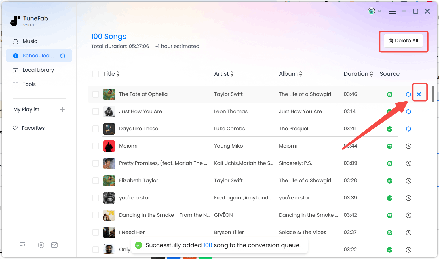 点击歌曲标题或封面图片上的“添加”或“添加到转换”按钮。您也可以点击界面右下角或播放列表内的按钮。然后,TuneFab 将检测曲目并将其列在右侧。