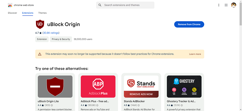 如果你只需要无广告的 Spotify 音乐,你可以尝试一下 uBlock起源 而不是 Spotify Premium 破解版应用程序。它是一个浏览器扩展程序和广谱内容拦截器。此扩展程序适用于 Chrome、Firefox、Opera、Edge 和 Thunderbird。它还可以拦截 Spotify 上的广告,因此要在 Spotify Web Player 上享受无广告音乐,只需安装扩展程序即可。